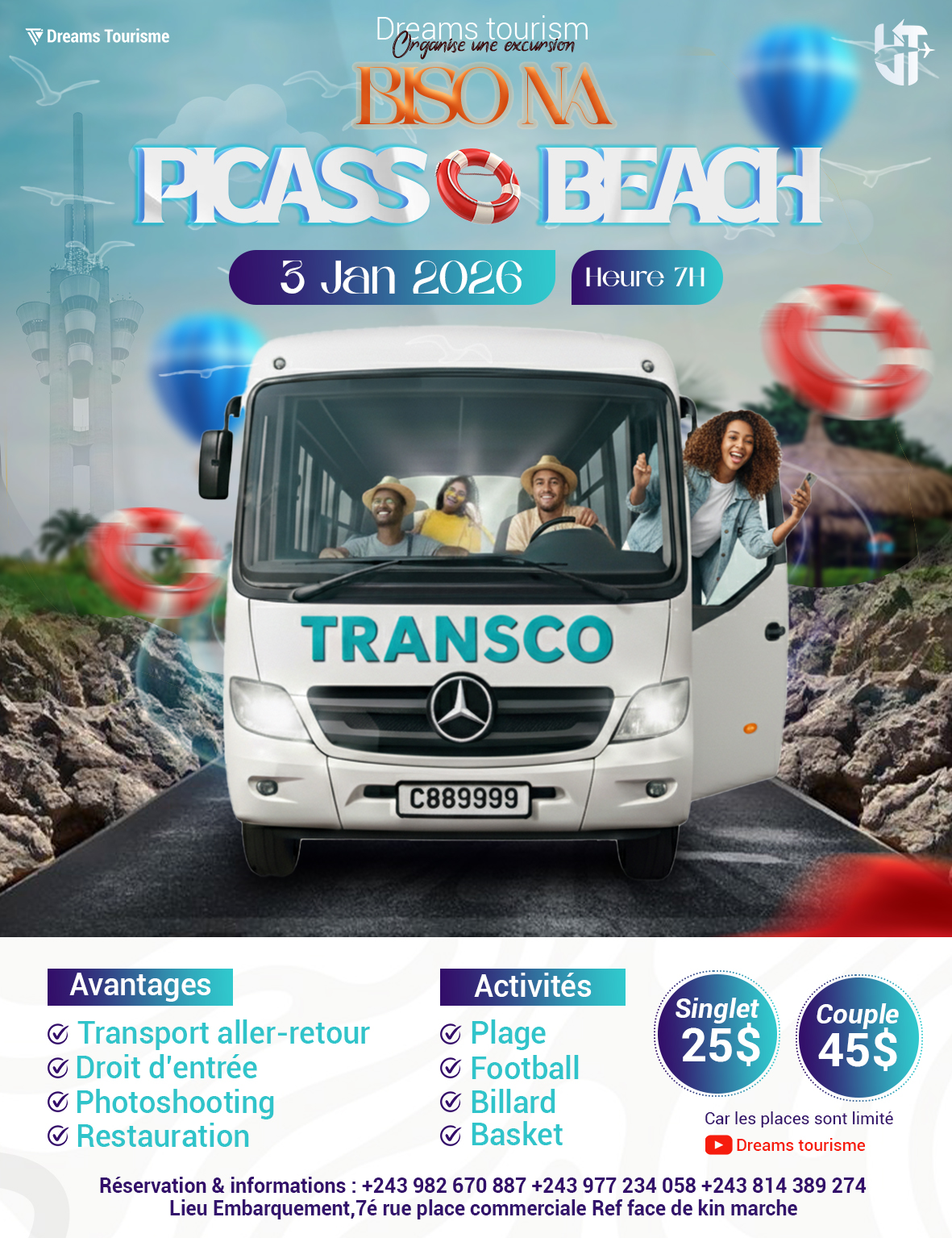 Départ à  7h00 avec Dreams Tourism pour une journée détente et fun à  Picasso Beach !